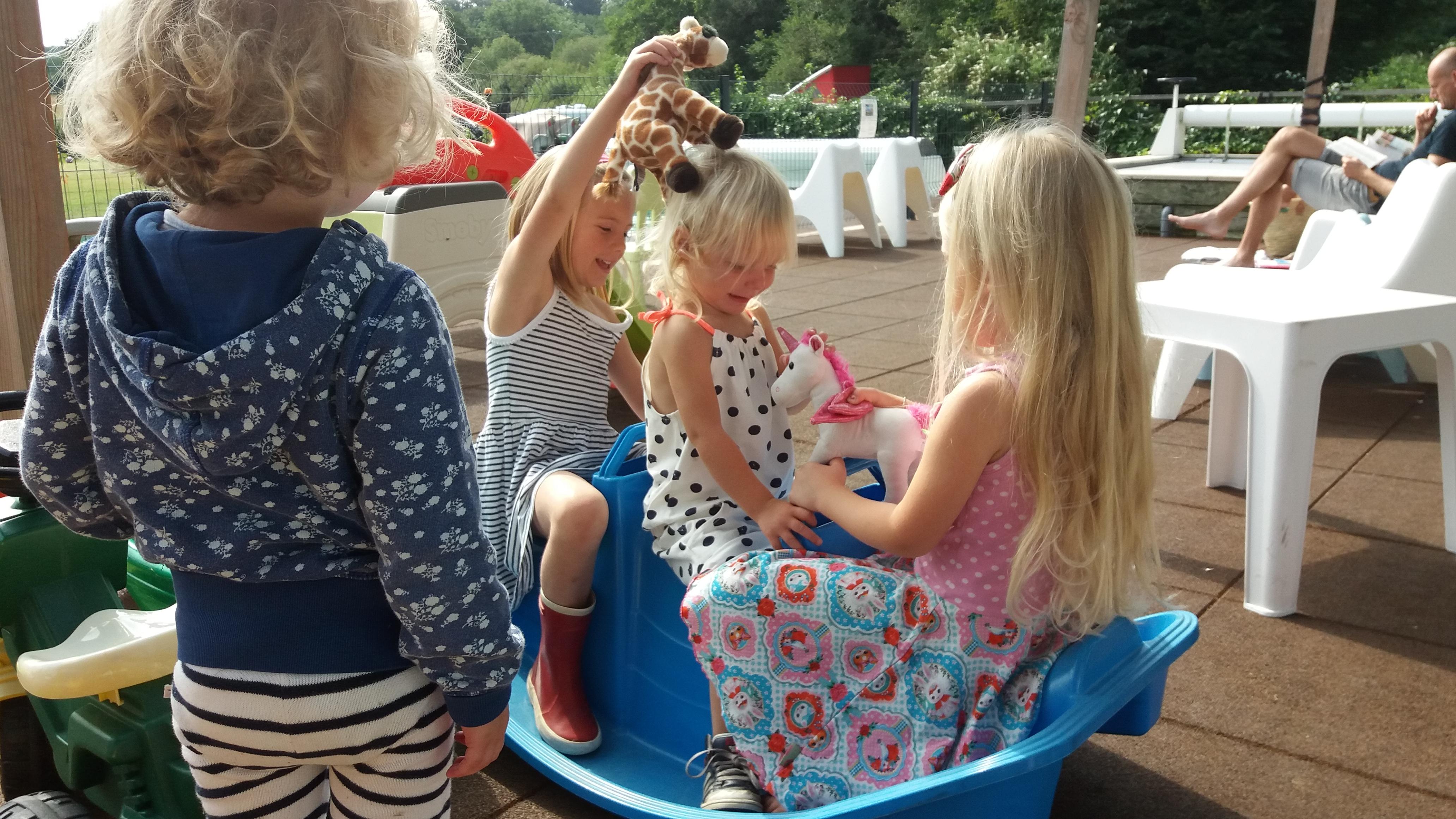 -Groot assortiment aan speelgoed en speeltoestellen: fietsjes en skelters, diverse trampolines, speelhuisjes, een grote trein gemaakt van oude wijnvaten.