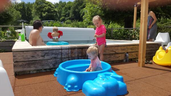 -Het zwembad is extra warm verwarmd voor de kleintjes, zodat ze lekker comfortabel met papa en mama kunnen zwemmen en dobberen.